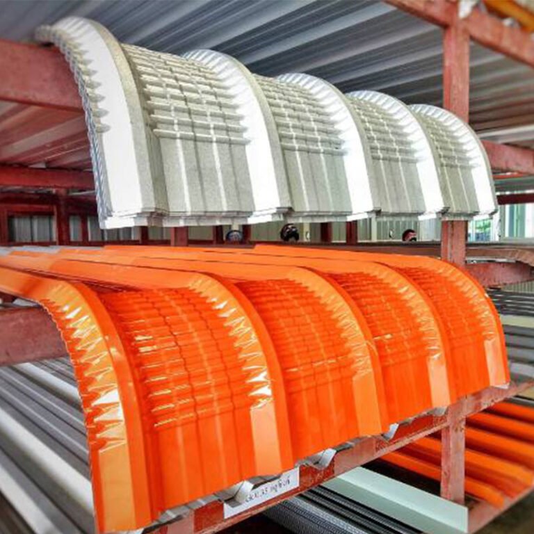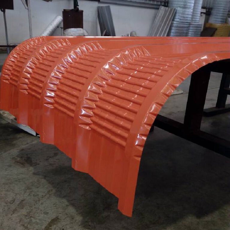*** มีรัศมีโค้งให้เลือกหลากหลาย โดยทั่วไปไม่ต่ำกว่า 300 มม. สามารถผลิตตามขนาดของลอนที่ต้องการ และเข้าเครื่องย้ำเพื่อดัดโค้งให้เข้ารูปกับโครงสร้าง